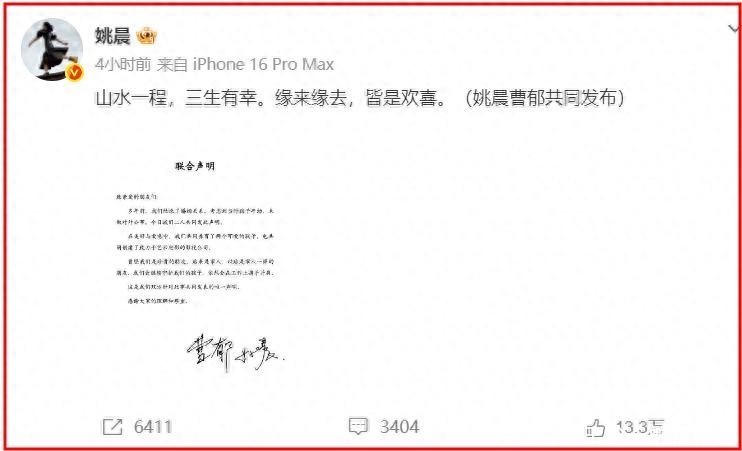 近日,姚晨在社交账号上发布了和曹郁的离婚声明。